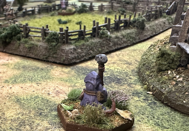 This solo game would be the second scenario of my campaign. The 3'x3' battlefield would have four fields nearest the edge of the battlefield where the characters would start. The other three board edges would be bordered by thick woods, forming an upside down "U-shape" facing the Splintered Band. Inside the woods would be five objective markers, each within 6"-10" of their respective table edges. A member of the party would have to contact each objective marker and roll on a table to see what enemies lurked nearby. This would simulate the band scouring the woods edges and springing any ambushes the rats may have laid for unwary monks.